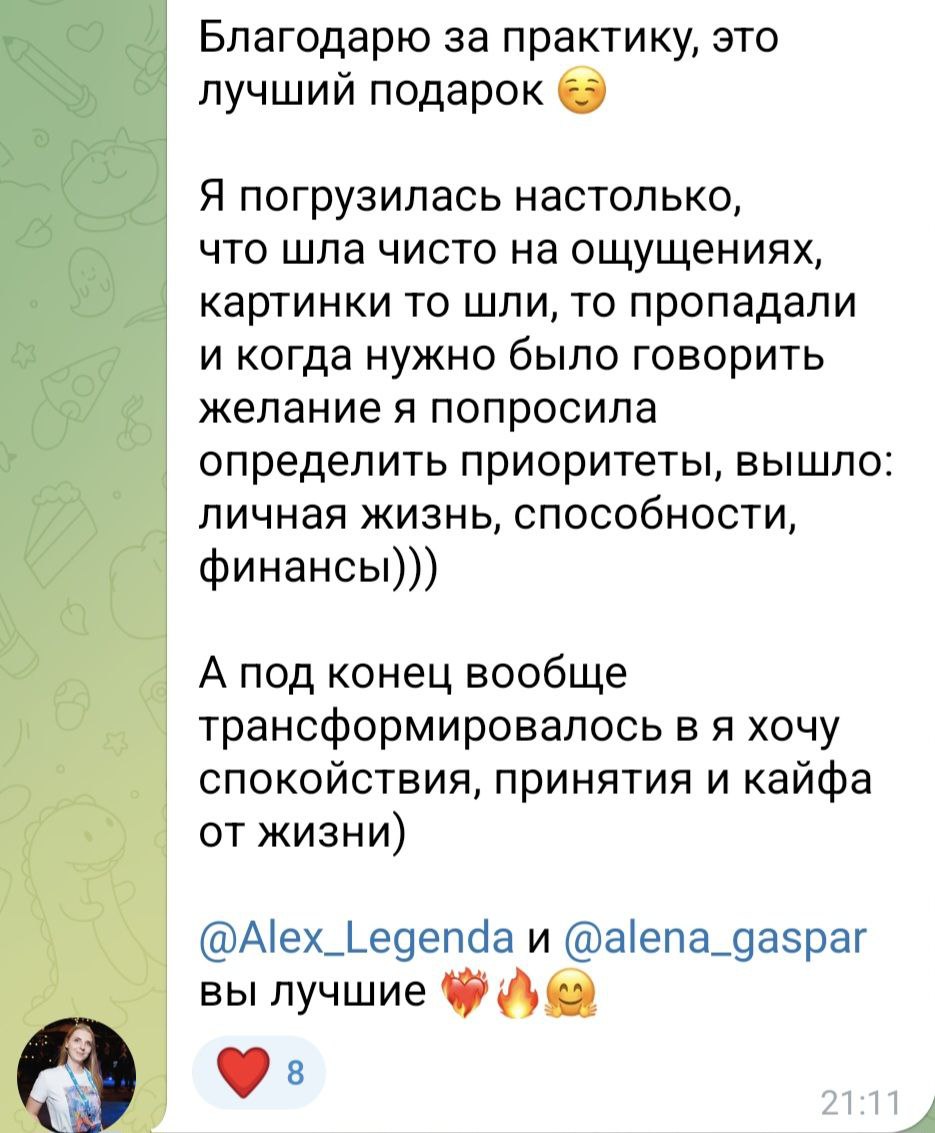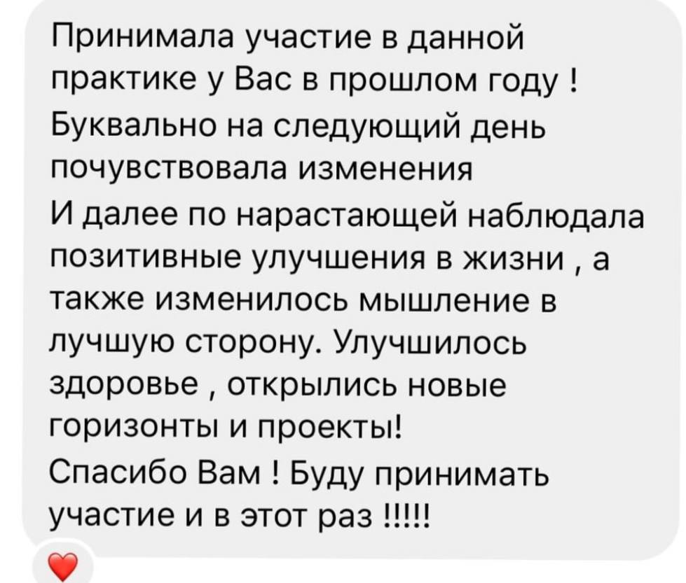 Учитывая, что такой день в году один, а желание, которое вы сформируете на практике — СБУДЕТСЯ, я думаю, что можно найти этот час наедине со мной и теми, кто с вами будет ее проходить.