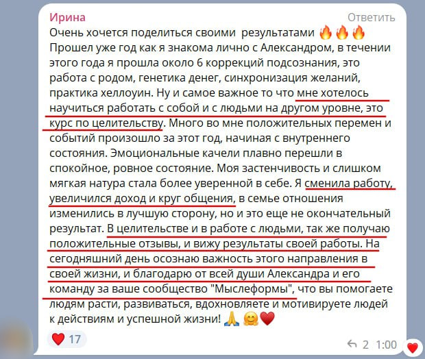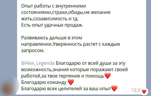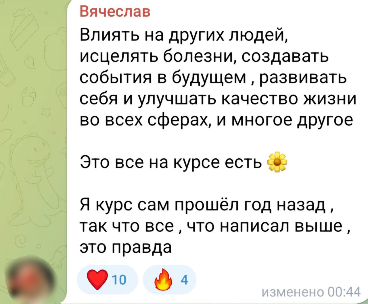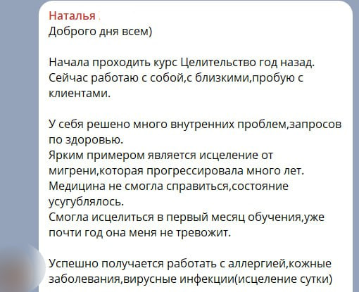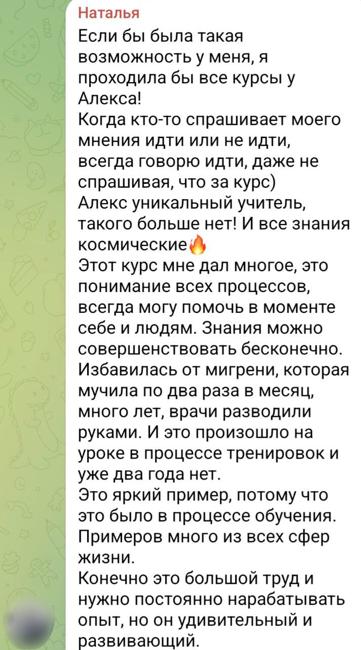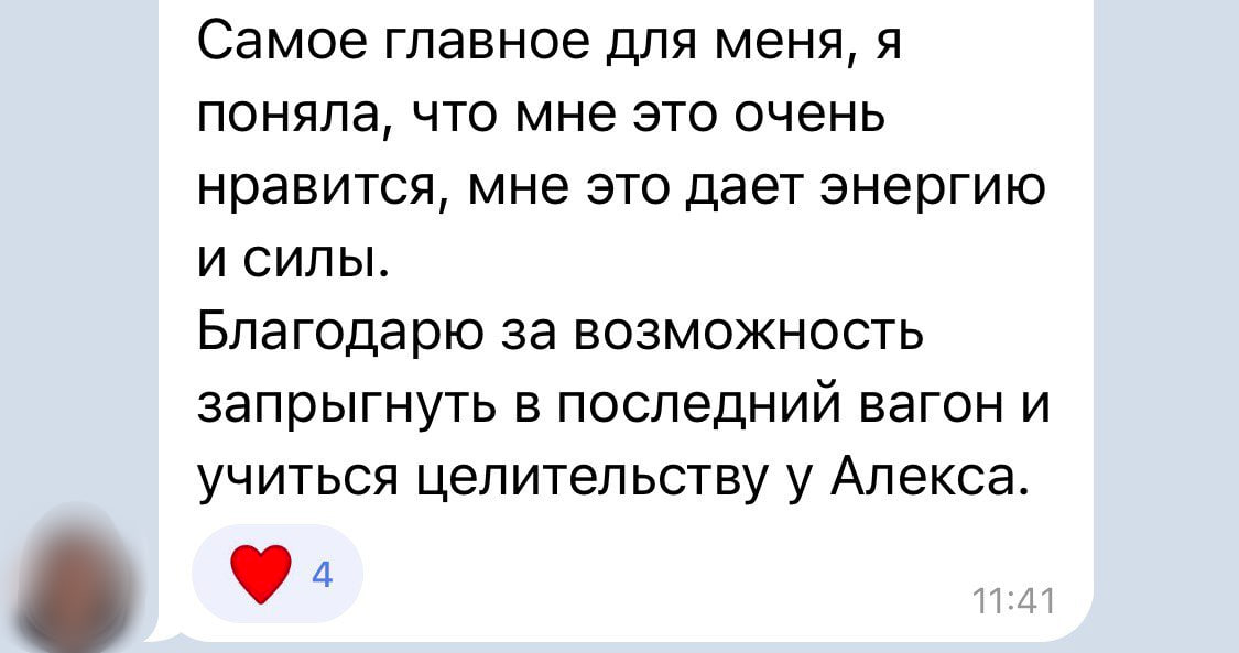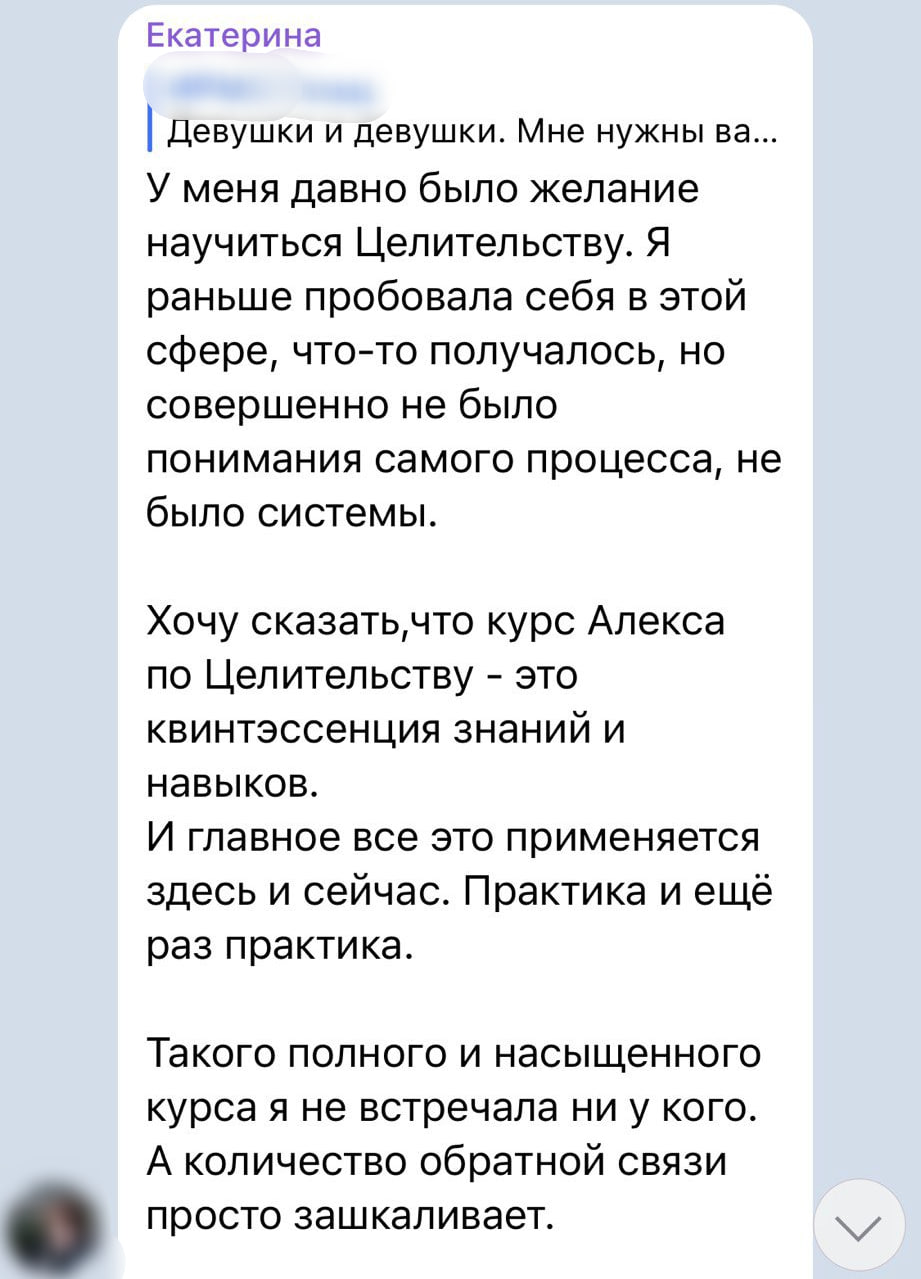 Хочу сказать, что курс Алекса по Целительству — это квинтэссенция знаний и навыков. И главное все это применяется здесь и сейчас. Практика и ещё раз практика. Такого полного и насыщенного курса я не встречала ни у кого. А количество обратной связи просто зашкаливает.