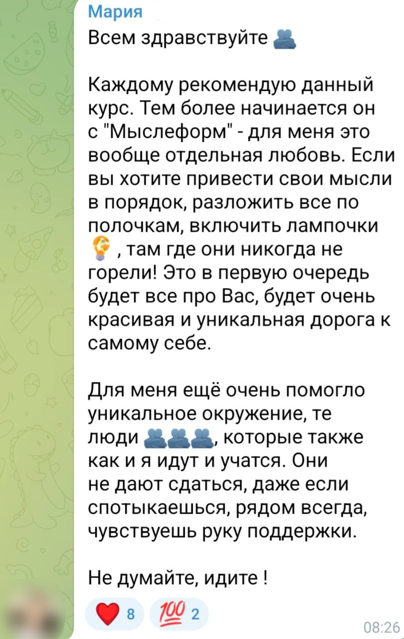 До старта программы вы получите доступ к тренингу "Мыслеформы", чтобы начать готовить свой мозг к тренингу. Кто начнет готовиться - вам будет легче тренироваться на курсе "Целитель".