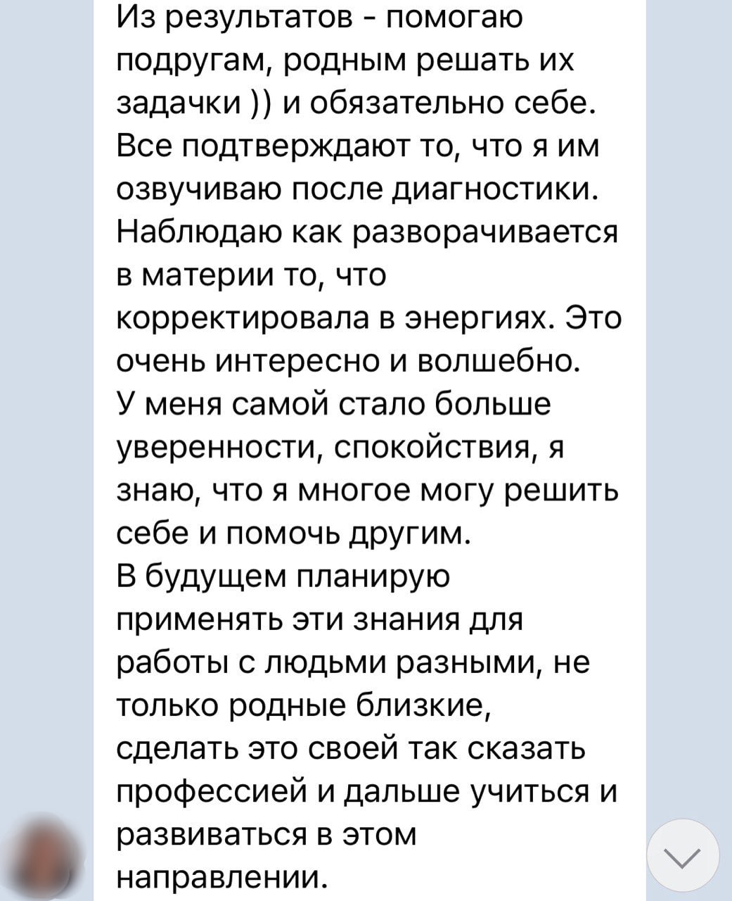 Привела в спокойное состояние девушку после переезда: работа не нравится, зарплата тоже. После моей работы она сама сказала, что стала спокойнее относиться к работе, даже дети стали вести себя потише (она воспитатель в детском саду). Стала уходить от тех, кто несёт негатив. Тщательнее стала выбирать окружение. Хотела уйти с работы, но мы с ней обсудили все варианты. Ей стали приходить предложения. Параллельно она заявила о себе в инстаграм. По образованию она психолог и хочет развиваться в этой деятельности. Сразу после консультации поменяла шапку профиля, написала пост. В дальнейшем поступил первый клиент. Стали приходить возможности.