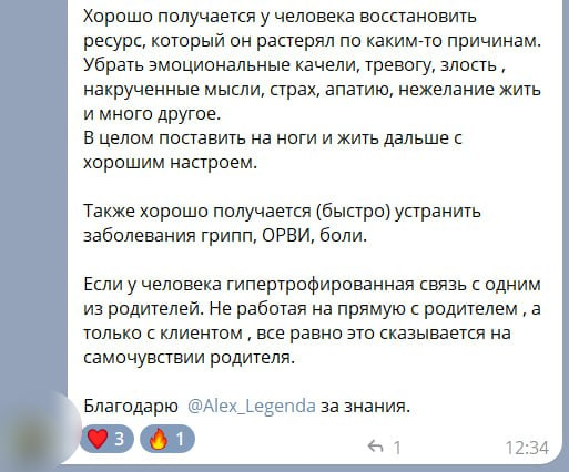 Так же в работе с людьми, часто ощущаю именно через свое тело их проблему со здоровьем. Ранее это было периодически и спонтанно в работе с людьми, а теперь есть инструмент, с помощью которого я по запросу уже чувствую. Именно этого и не хватало ранее в получаемых знаниях, не понимала как делать запрос и получать ответ.