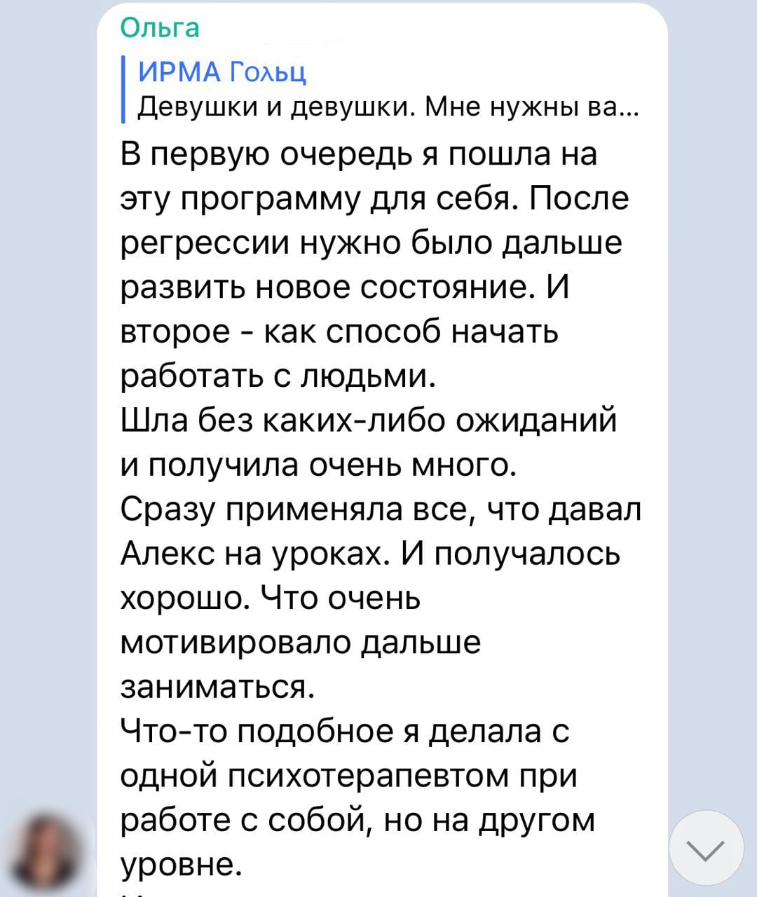 Я свою интуицию и умение чувствовать энергии людей на курсе раскрыла настолько, насколько сейчас это возможно для меня.