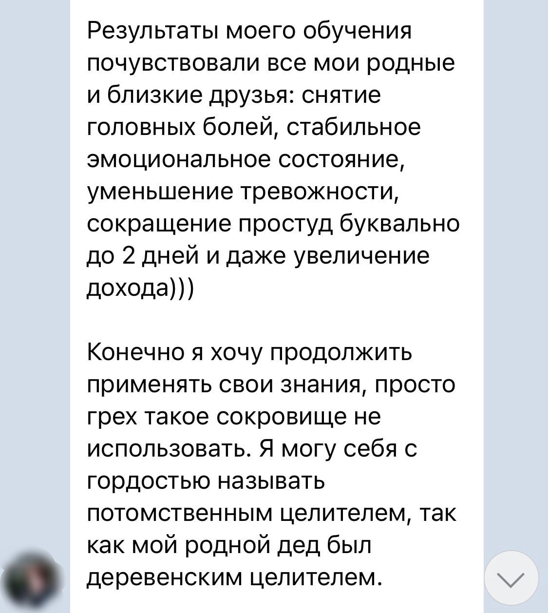 С начала обучения на целительстве я начала меняться в плане того, что больше стала рассказывать о себе, до этого стеснялась, не знала как примут эту информацию окружающие. Теперь мне все равно, что скажут, я стала увереннее, спокойнее.